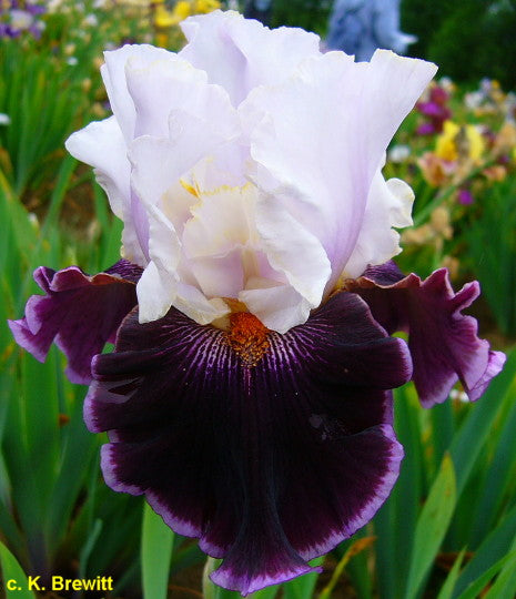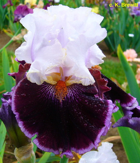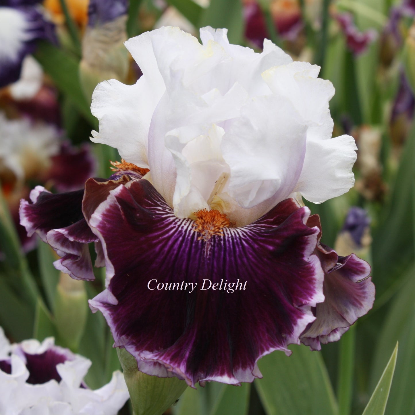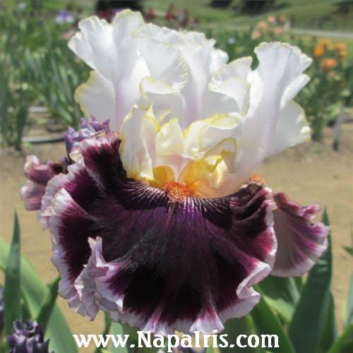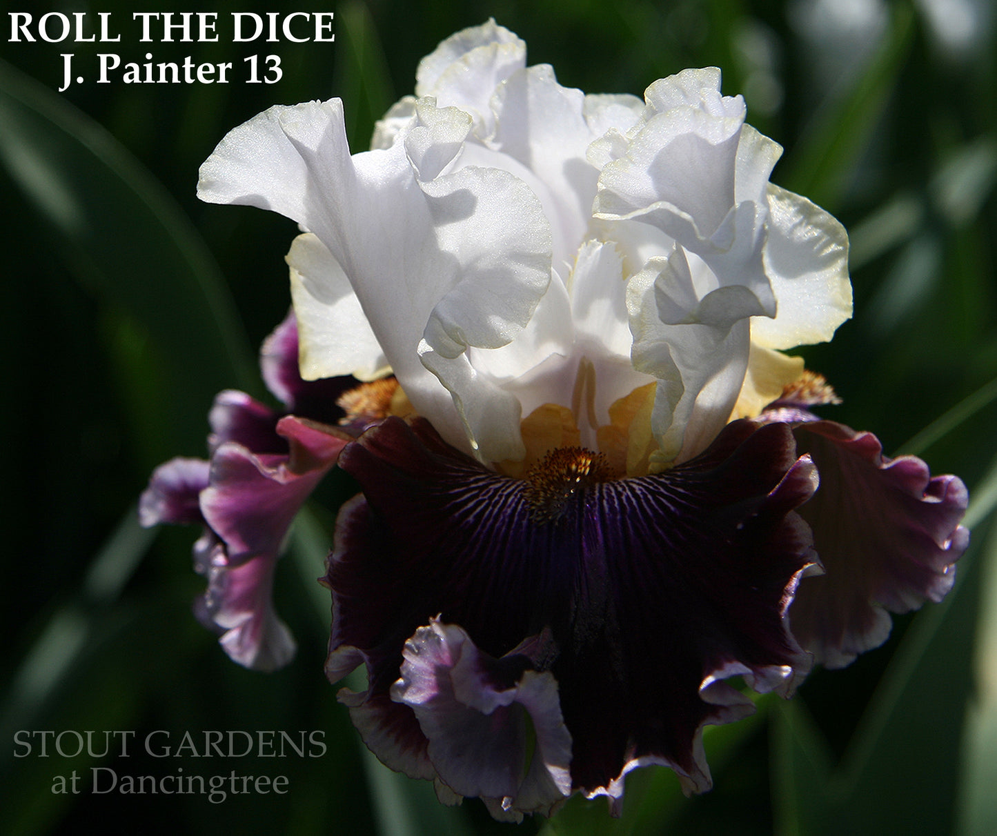 'Roll The Dice' (John Painter, R. 2012). Seedling# J05-57D. TB, 33" (84 cm). Midseason bloom. Standards white, yellow at lower petal edges; style arms white, crest edged yellow; falls dark plum-purple, narrow white to pale lavender edge, white haft marks; beards burnt orange; pronounced musky fragrance; purple based foliage. Seedling# L03-31A: ('Halo Everybody' x 'Madame Mustard') X 'Starring'. Napa Country 2013.