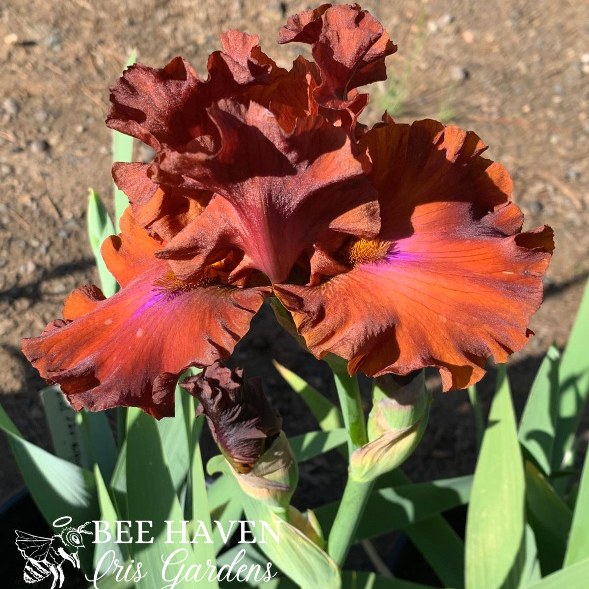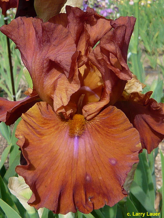 'Rustic Fantasy' (Larry Lauer, R. 2019). Seedling B10-33. TB, 34" (86 cm), Midseason to late bloom. Standards copper brown (RHS 175B); style arms hazelnut (167A); falls copper brown, flash of plum-purple (80B) around and below beards; beards orange (25A), apricot-buff (171C) end; ruffled; pronounced sweet fragrance. 'Tiff' X 'Flame Amber'. TBIS 2019.