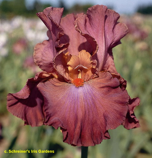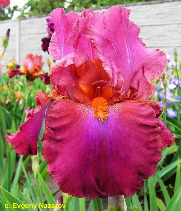 'Sambuca Rosa' (Schreiner, R. 2005). Seedling EE 418-1. TB, 35" (89 cm), Early to midseason bloom. Raspberry rose (RHS 47A) self; falls have lavender wash before beard; beards tangerine. 'Outrageous Fortune' X 'Festive Mood'. Schreiner 2005. Honorable Mention 2009.