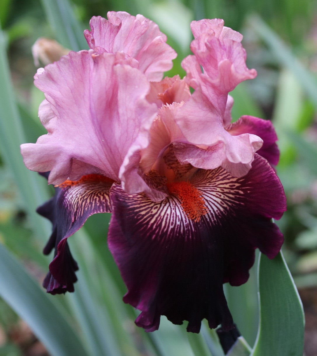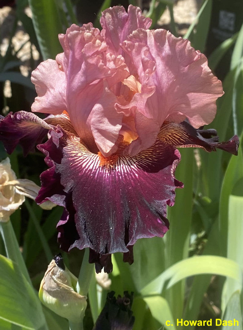 'Sangiovese' (Howard Dash, R. 2022) Seedling ADG 15-10-03, TB, 33" (84 cm), Midseason bloom. Standards and style arms pink; falls dark burgundy, white zone under beard, burgundy veining; beards burnt orange. 'Gypsy Lord' X 'Tuscan Summer'. Picacho Mountain 2023.
