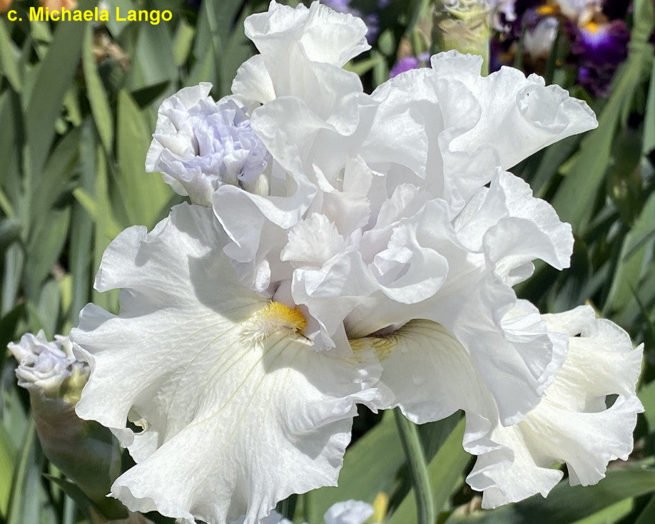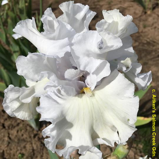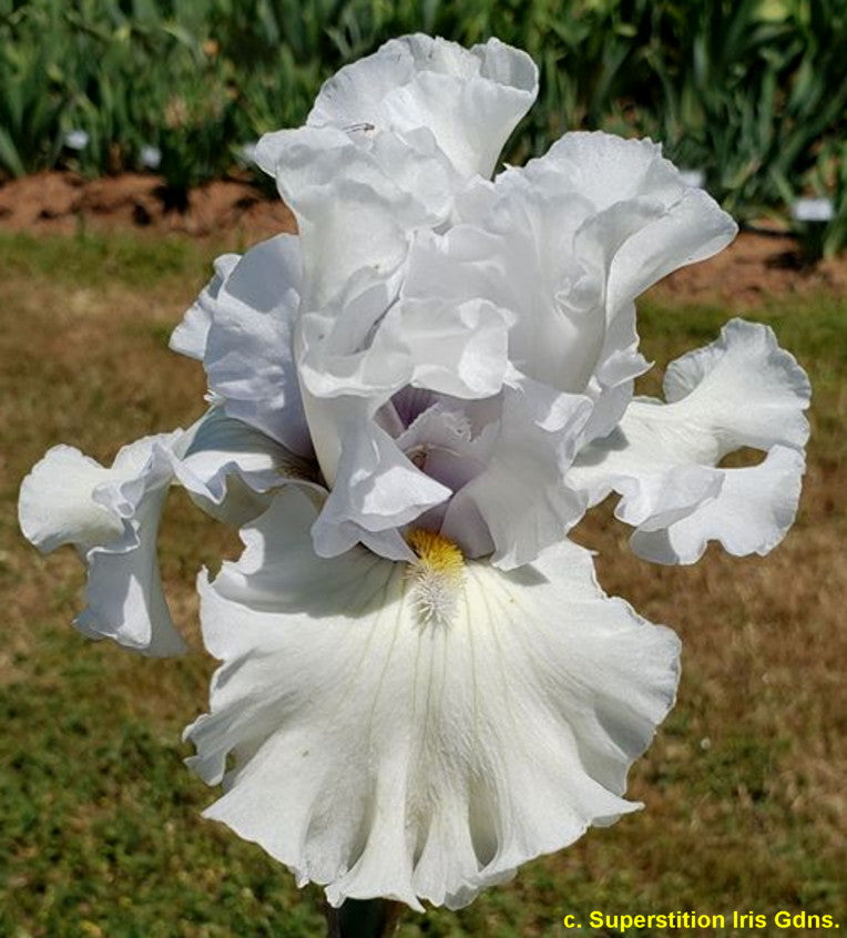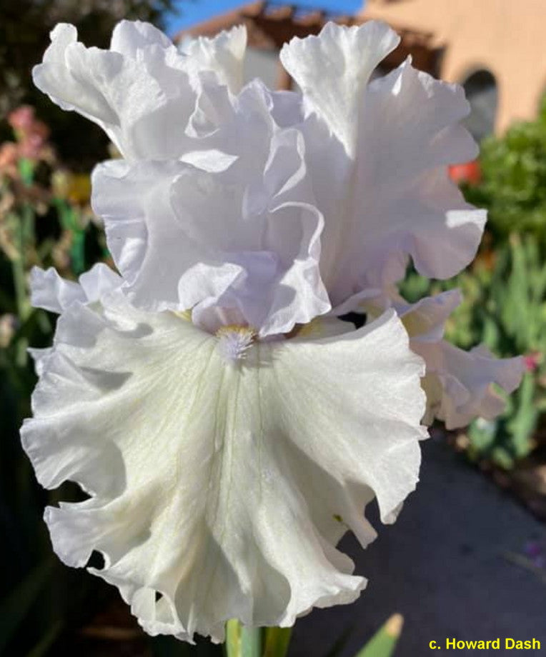 'Santa Cruz Surf' (Joseph Ghio, R. 2019). Seedling 14-115G. TB, 40" (102 cm), Late midseason bloom. Icy white self, green cast in heart and shoulders; beards creamy white. Platinum 'Passion' X unknown. Bay View 2019. Honorable Mention 2021. Franciris Mention 2022.