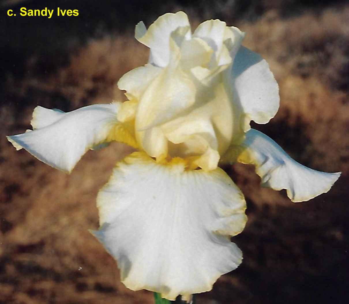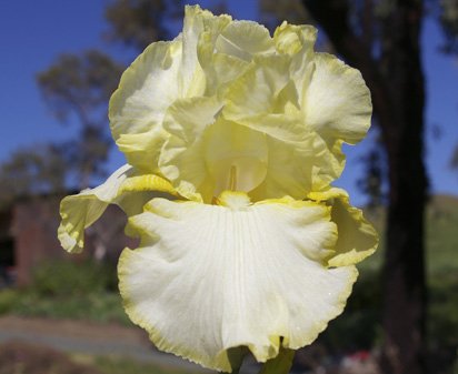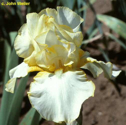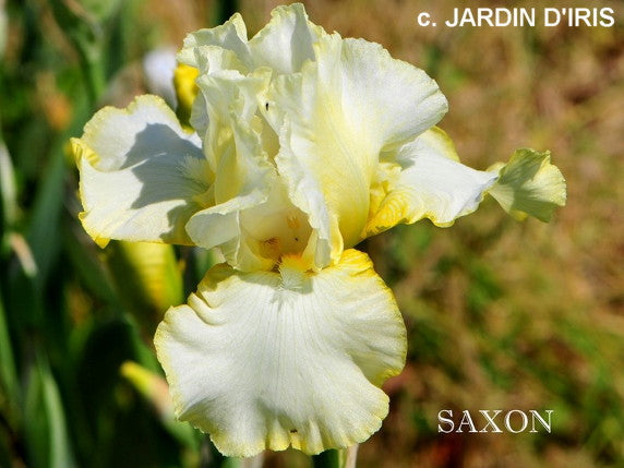 'Saxon' (Monty Byers, R. 1989). Seedling# D10-115. TB, 34" (86 cm). Early to midseason bloom and rebloom. Standards creamy light yellow; falls white, narrowly edged light yellow; white beard tipped yellow orange; ruffled. 'Soap Opera' X 'Brother Carl'. Moonshine 1990.