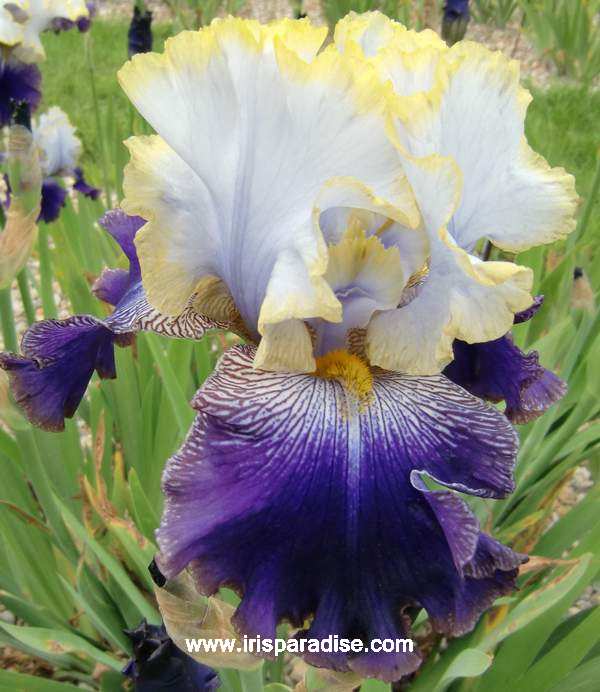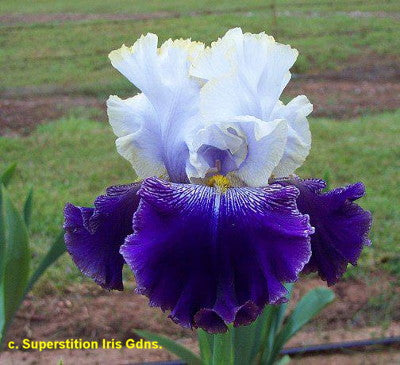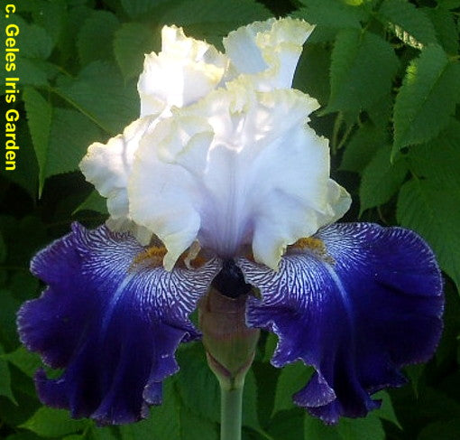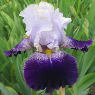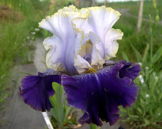 'Slovak Prince' (Anton Mego, R. 2002). Seedling# AM-93/0038. TB, 33" (85 cm), Midseason bloom. Standards white shaded orchid lavender, slight blue veining, 1/8" gold rim; style arms silver lavender veined blue, gold edge; falls dark velvety blue purple, slightly lighter rim, white area around gold beard with purple veining changing to brown; ruffled; slight sweet fragrance. 'Edith Wolford' X 'Queen In Calico'. Aitken 2003. Honorable Mention 2005; Award of Merit 2007; Wister Medal 2009.