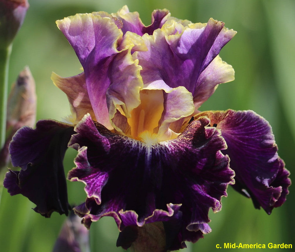 'Spine Tingler' (Thomas Johnson, R. 2022) Seedling TK22YY, TB, 40" (102 cm), Early to midseason bloom. Standards inky purple, precise gold edging; style arms light purple, yellow edged crests; falls dark violet, creamy-white luminata patch touched gold, short white dart below beard; beards orange; sweet fragrance. 'Dancing in the Dark' X 'Belle Fille'. Mid-America 2022. Honorable Mention 2024.
