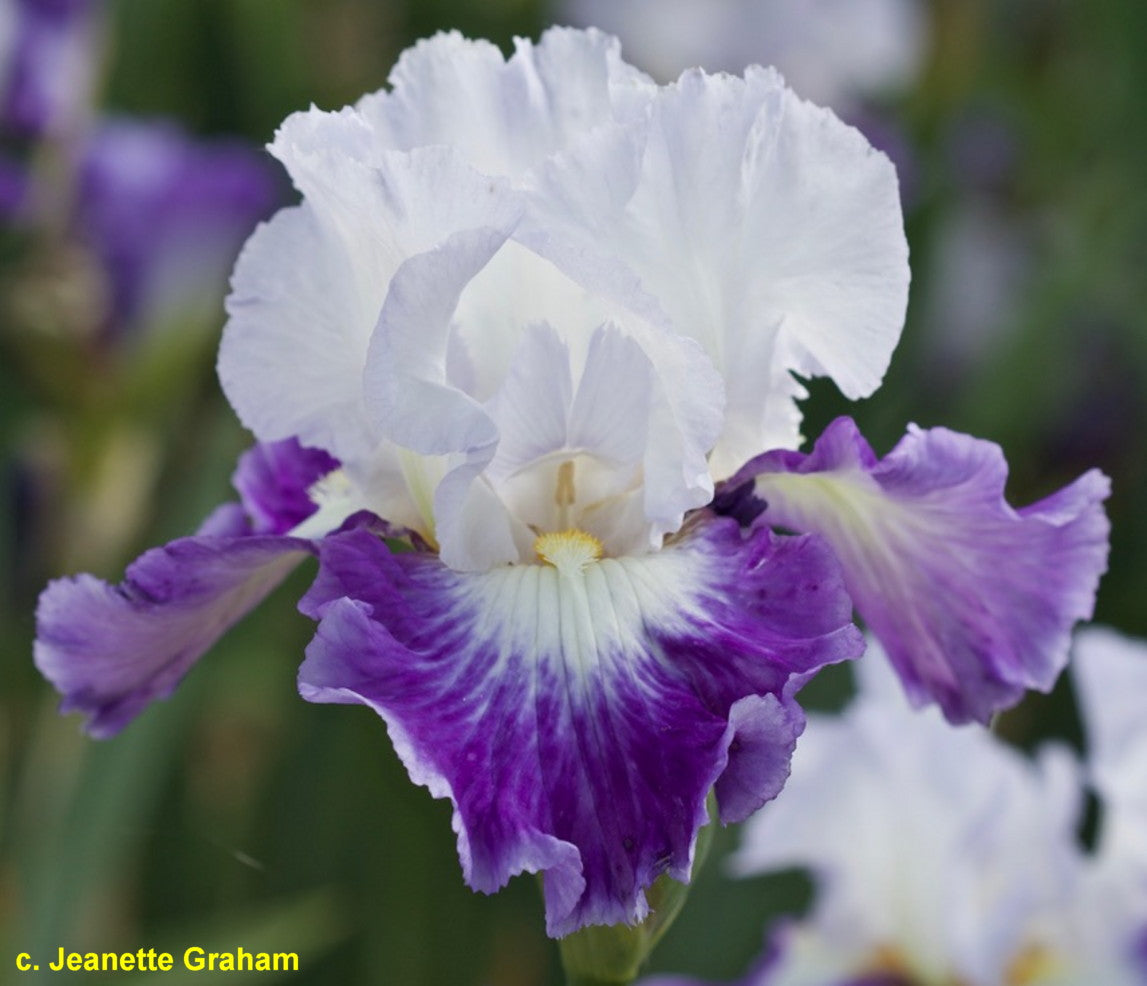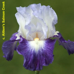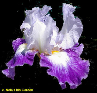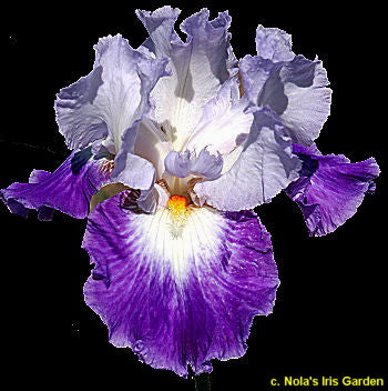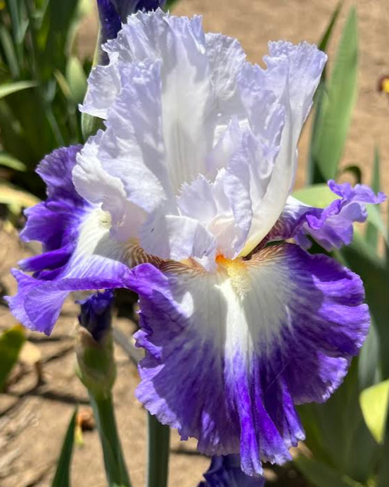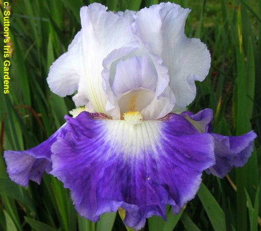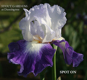 'Spot On' (Michael Sutton, R. 2007). Seedling R-122-A. TB, 36" (91 cm). Midseason to very late bloom and re-bloom. Standards ice white; style arms pale blue; falls french blue, white blaze, lighter edge, red purple shoulders; beards yellow, white at end; pronounced sweet fragrance. Seedling M-901-AA: ('Silver Fizz' x seedling H-178-H: ('Sky Hooks' x 'Drum Roll')) X 'Ocean Clouds'. Sutton 2008. Honorable Mention 2011.
