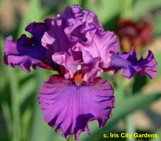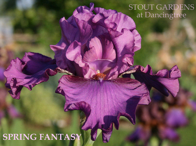 'Spring Fantasy' (Richard Tasco, R. 2001). Seedling# 96-TB-21-04. TB, 35" (89 cm), Midseason to late bloom. Ruffled magenta purple, falls. with lilac purple (RHS 70A) shoulders, style arms with dark burnt orange toward base; beards tangerine. 'Sudden Impact' X 'Aplomb'. Superstition 2002. Honorable Mention 2004.