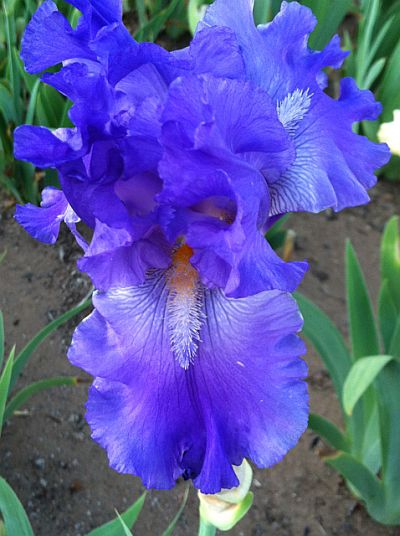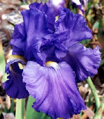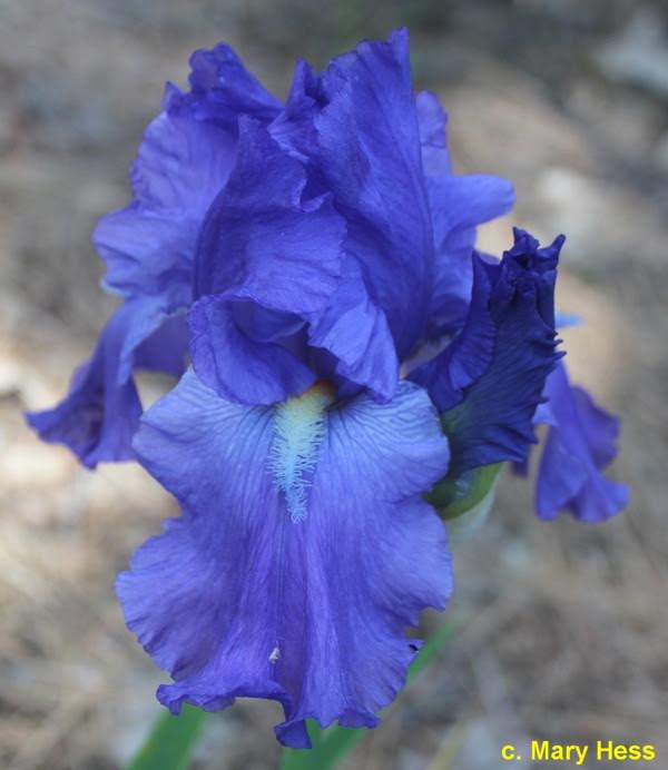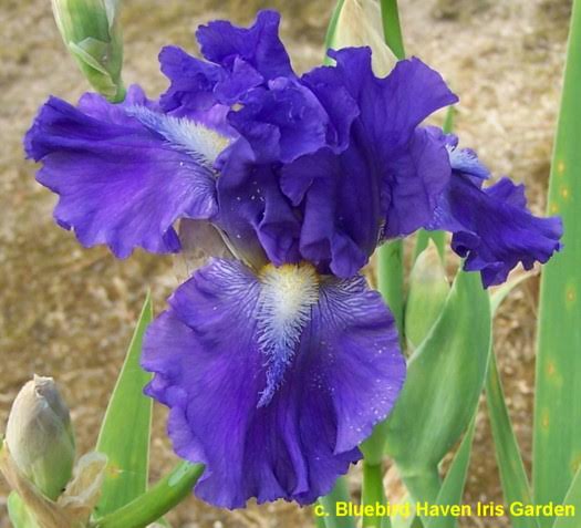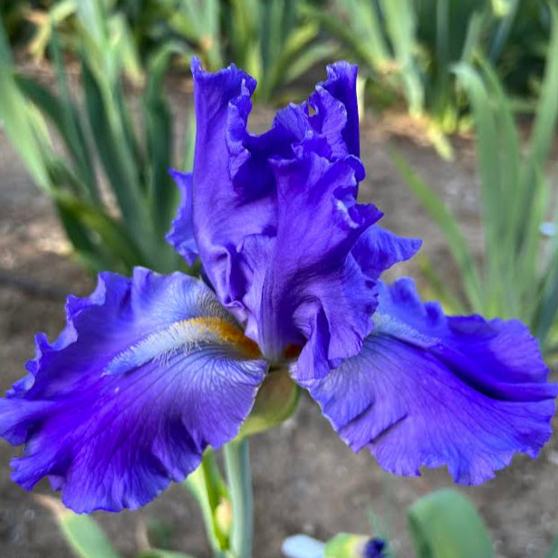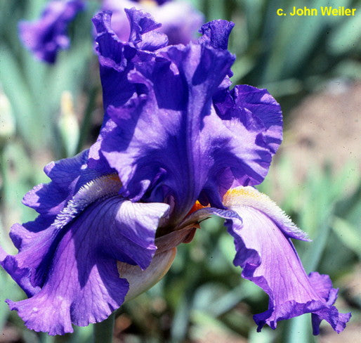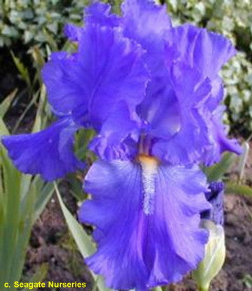 'Stingray' (Monty Byers, R. 1988). Seedling D175-104. TB, 36" (91 cm), midseason early to midseason late bloom and rebloom. Standards medium violet blue; Falls slightly deeper; blue beard tipped yellow, long violet horns during spring bloom; heavily ruffled; pronounced sweet/musky fragrance. Seedling B-8-2: ('Cease Fire' x 'Sky Hooks') X 'Scented Bubbles'. Moonshine Gardens 1989.