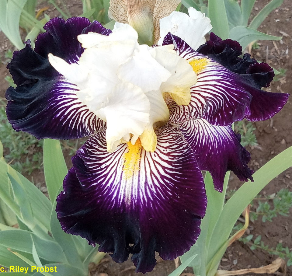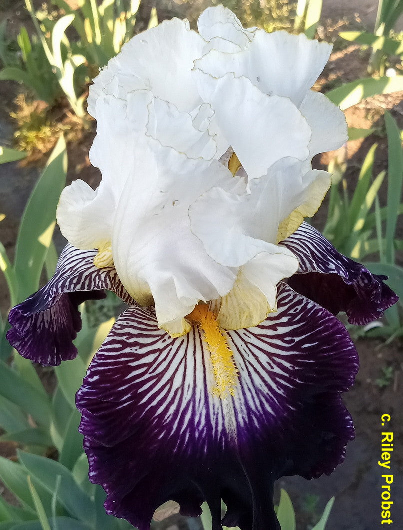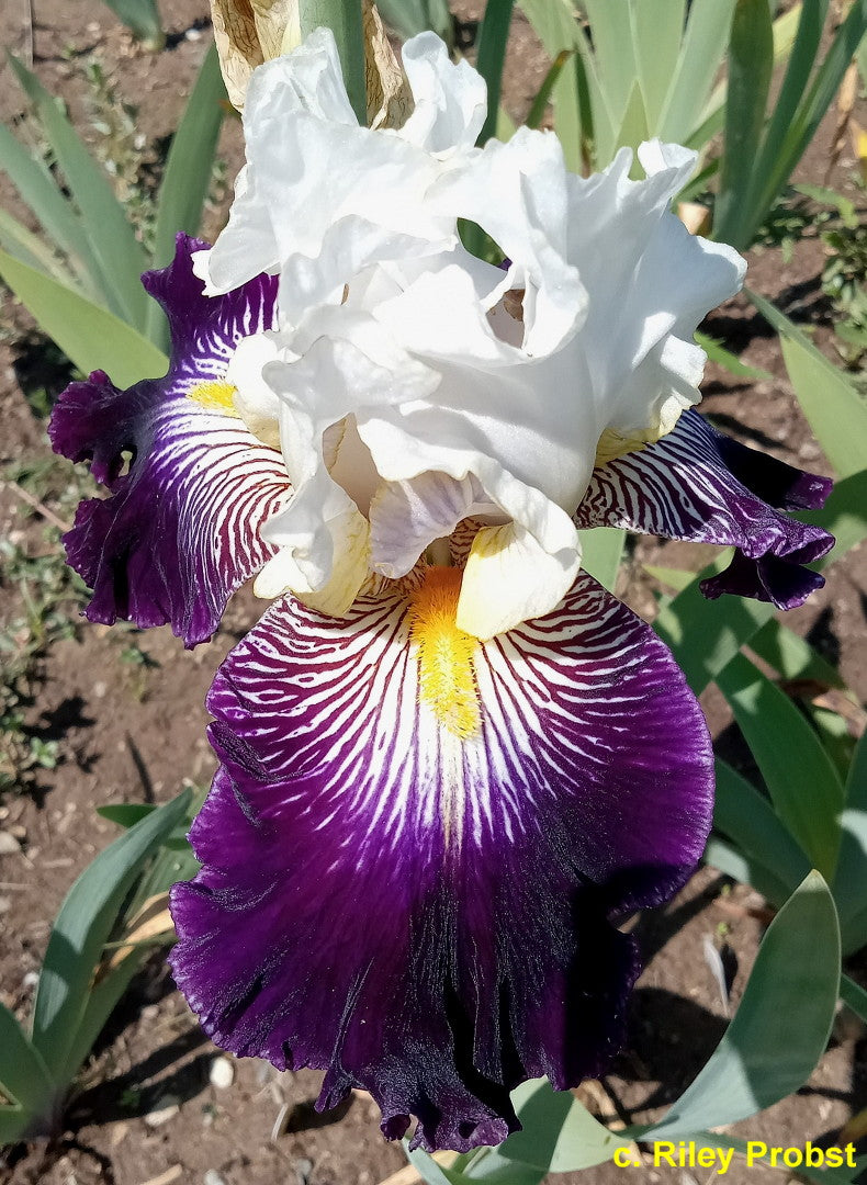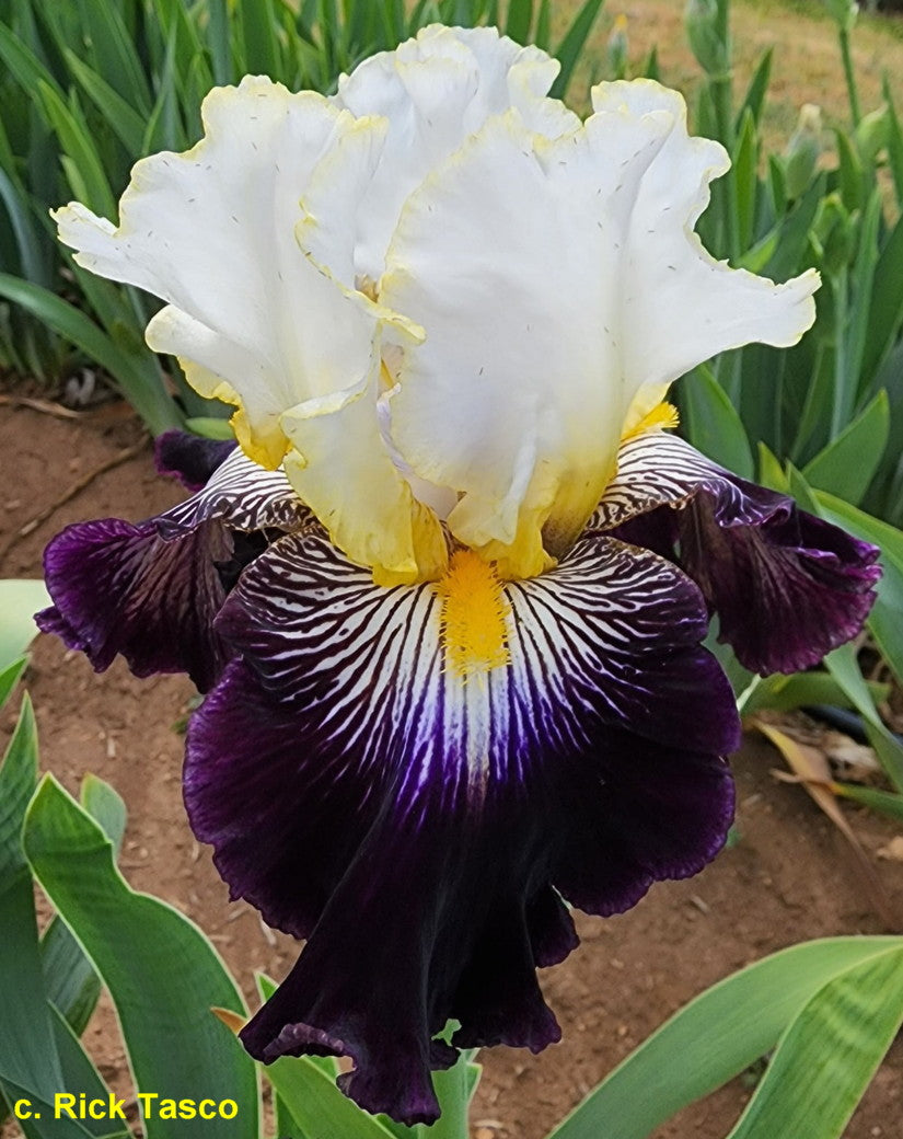 'Storm Lord' (Richard Tasco, R. 2022) Seedling 18-TB-01-15, TB, 35" (89 cm), Midseason bloom. Standards white, thin yellow halo on edges; style arms white, violet streaked crests; falls dark purple, white starburst; beards orange in throat, yellow in middle and ends. 'Reckless Abandon' X 'Irresistible Charm'.