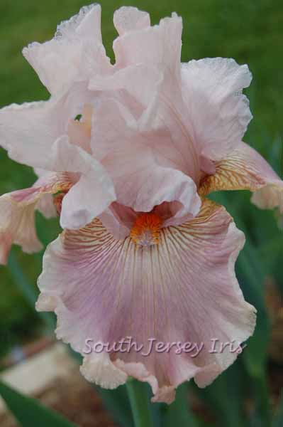'Sunrise At Dawn' (Margie Valenzuela, R. 2013). Seedling# BB4-PL. TB, 35-36 (8981 cm), Early midseason to midseason bloom. Standards light medium pink, near white edges; style arms pink, yellow hue; falls peach-pink shades, near-white edges, gold veining and gold tones on shoulders; beards orange in throat and middle, white end.('Bursting Bubbles' X (seedling# G+G x 'Puccini')