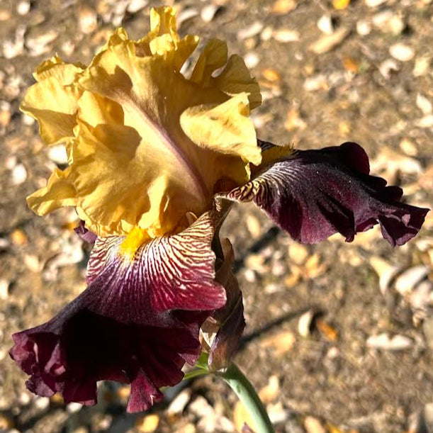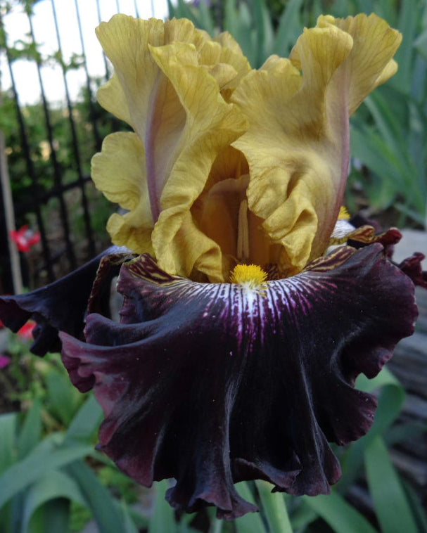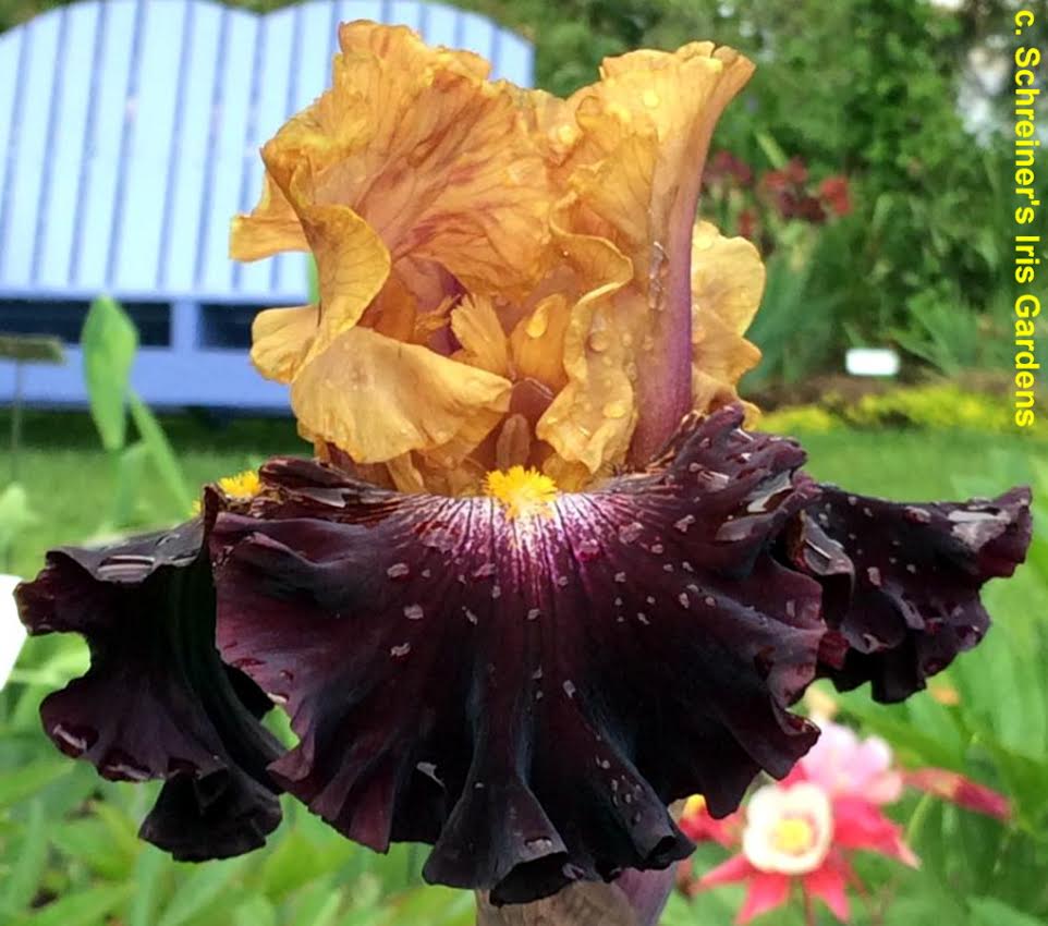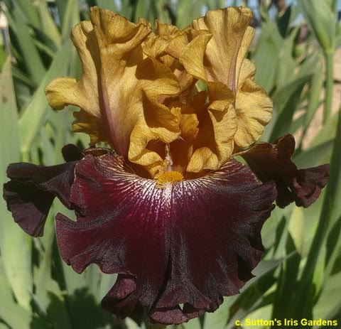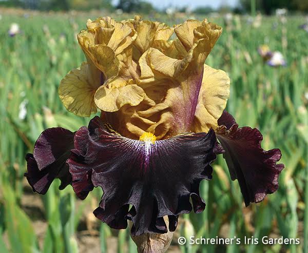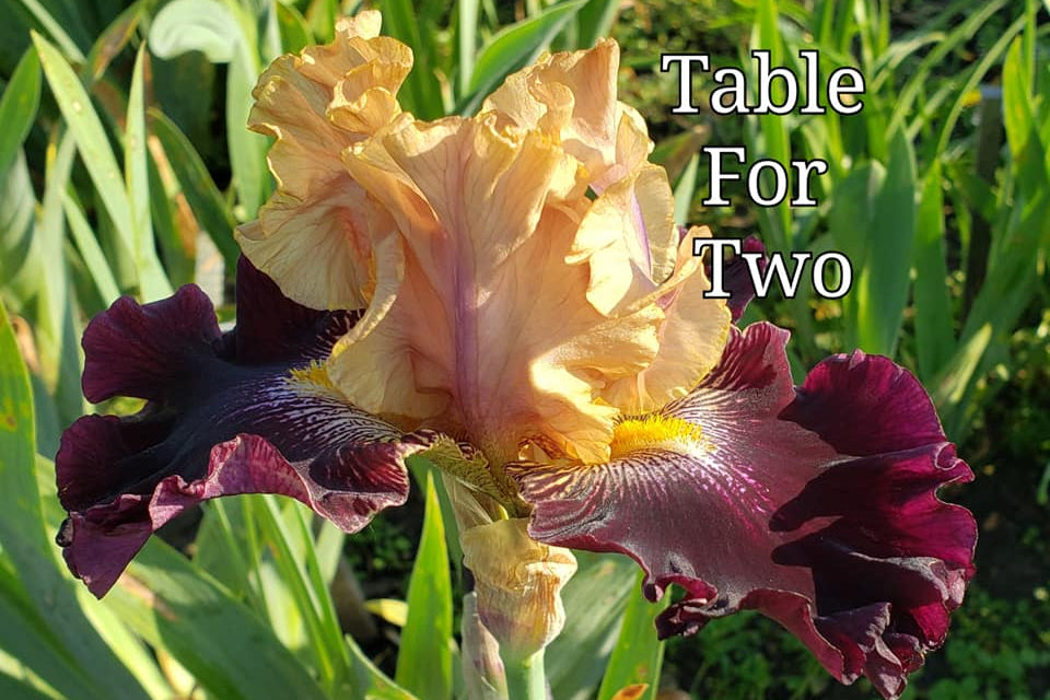 'Table For Two' (Schreiners, R. 2016). Seedling# WW 81-1. TB, 36" (91 cm). Very early bloom. Standards tawny brown changing to violet at midribs; falls black-red, white blaze around beard; beards yellow. Seedling# NN 149-1, 'Ancient Airs' pod parent, X 'Double Click'. Introduced 2016 Schreiner. Schreiner's Catalog 2016. Third place winner of Moscow International TB Iris Competition 2018; Honorable Mention 2018; Award of Merit 2021.