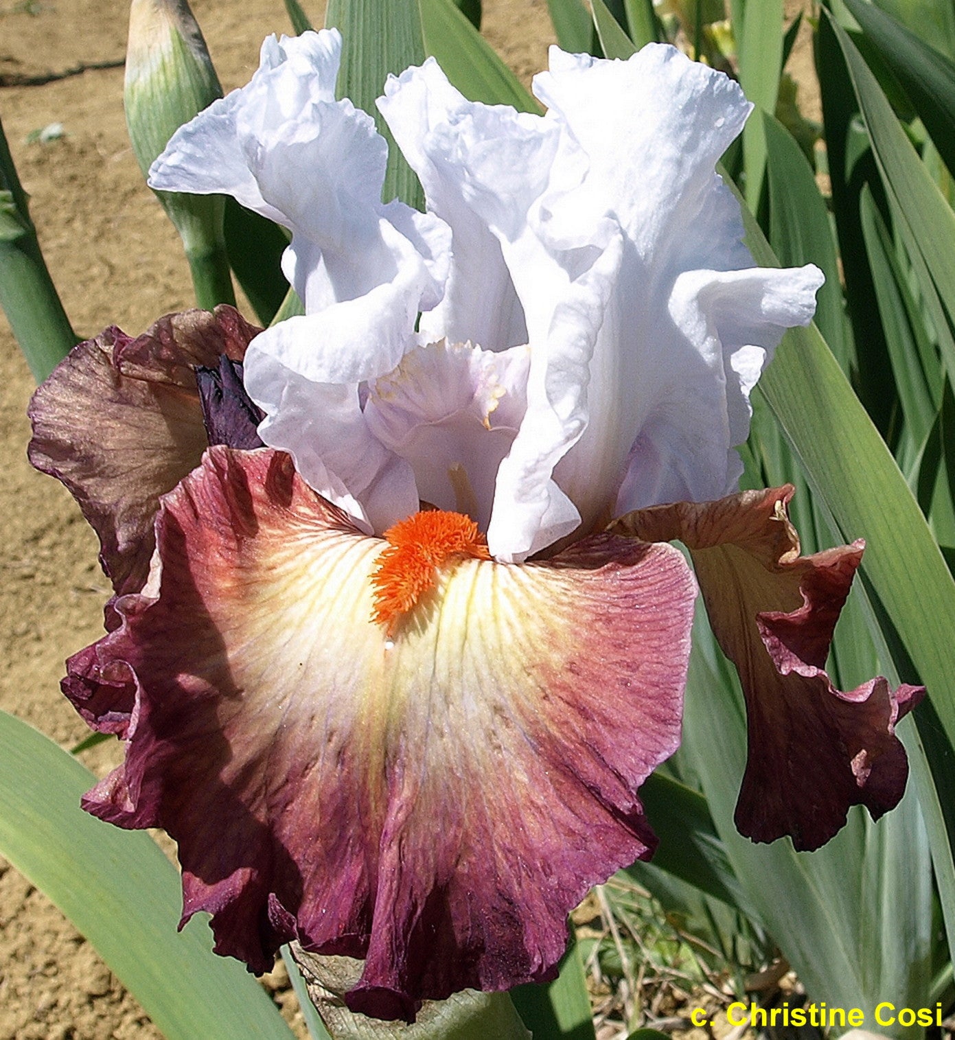 'Tantalizing' (Barry Blyth, R. 2014) Seedling# V332-5. TB, 33" (84 cm), Early to midseason bloom. Standards white, slight icy lavender on opening; falls light raspberry, creamy raspberry center; beards vibrant tangerine; slight sweet fragrance. 'Stylish Edge' X seedling# T315-A, 'Chasing Destiny' sibling 201516 Tempo Two. Tempo Two 2015-16