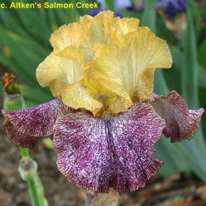 'Temporal Anomaly' (Richard Tasco, R. 2007). Seedling# 00-TB-08-63. TB, height 38" (97 cm). Midseason bloom. Standards honey butterscotch veined darker, slightly darker toward edges; style arms golden yellow, lighter near midrib; falls cold white heavily dotted and stippled burgundy grape, very thin very pale yellow edge; beards white tipped burnt gold; lightly ruffled; foliage heavily tinged purple; slight sweet fragrance. 'Tennessee Woman' X seedling# 96-TB-08-53, 'Celestial Explosion' sibling. Superstition 2007. Honorable Mention 2009, Award of Merit 2011, Wister Medal 2015.