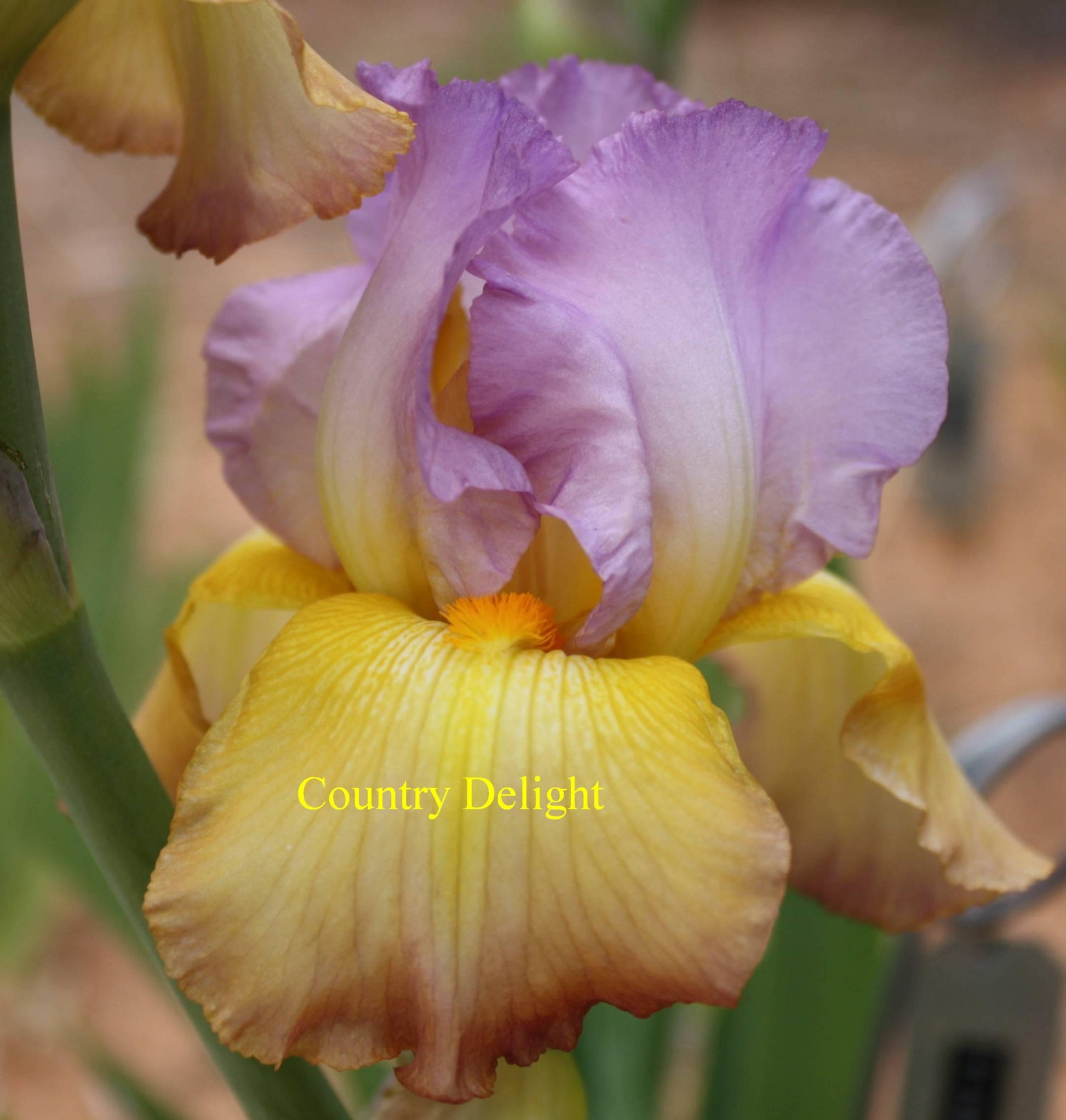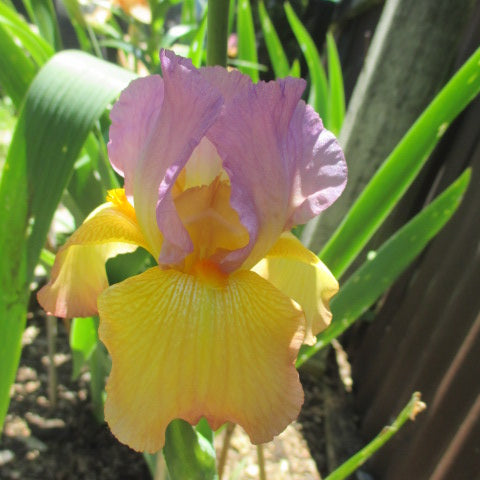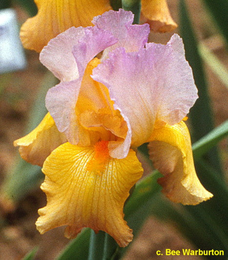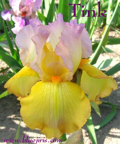'Tink' (John Durrance, R. 1991). Seedling #D86-2. BB, 26" (65 cm), Early to midseason bloom. Standards lavender; falls gold; beards gold orange. Purple-based foliage.'Little Susie' X 'Tinker-Tam'. Long 1991. Honorable Mention 1993; Award of Merit 1997.