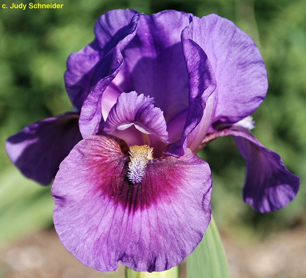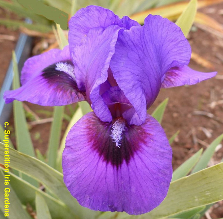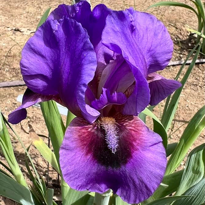 'Violet Storm' (Richard Tasco, R. 2019). Seedling 14-AM-12-24-RE. AB (OGB-), 22" (56 cm), Early midseason bloom and rebloom. Standards violet, lightly veined; style arms violet, slight tan-cream edges; falls violet, lightly veined, small black signal with plum-cherry wash on sides; beards based white, tips golden maize in throat and middle, light blue-violet tips at end; slight fragrance. 'Byzantine Ruby' X 'Replicator'. Superstition 2019