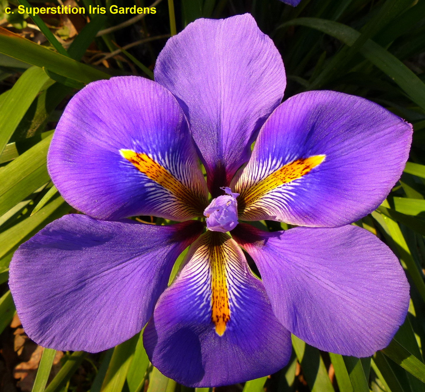 'Winter Echoes' (Richard Tasco, R. 2011) Seedling #99-UNG-06-24. SPEC (unguicularis), 12" (30 cm). Late midseason bloom. Standards dark purple; style arms same, slight yellow edges; falls dark purple, few white veins below bold orange signal; very large wide flower; sweet fragrance. 'Wishmaster' sibling. Superstition 2011.