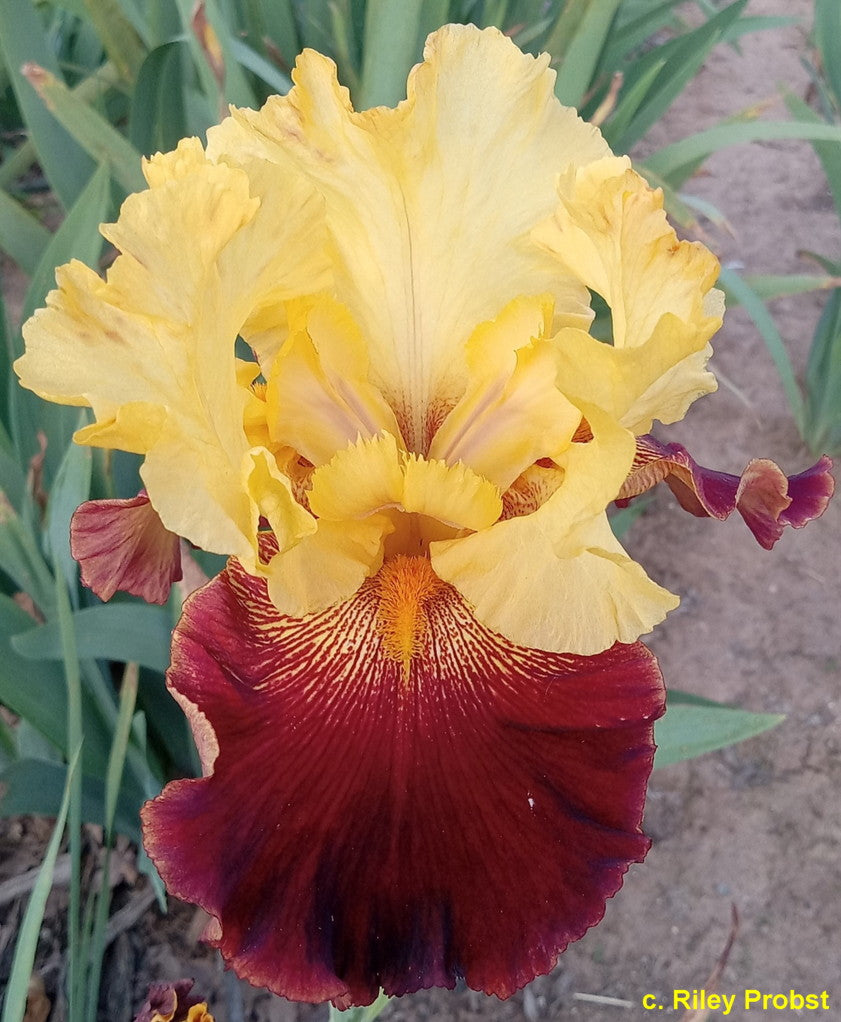 'Witchy Woman' (Howard Dash, R. 2020) Seedling ADG 13-17-02. TB, 34" (86 cm), Early midseason bloom. Standards and style arms gold; falls gold base, overlaid with firebrick red veining and wide rim, faint gold rim; beards light orange; slight fragrance. Seedling ADG 11-09-03: ('Ziggy' x 'Living on the Edge') X 'Bottle Rocket'. Picacho Mountain Iris 2021. Favorite Guest 2023; Honorable Mention, 2023; Award of Merit 2025.