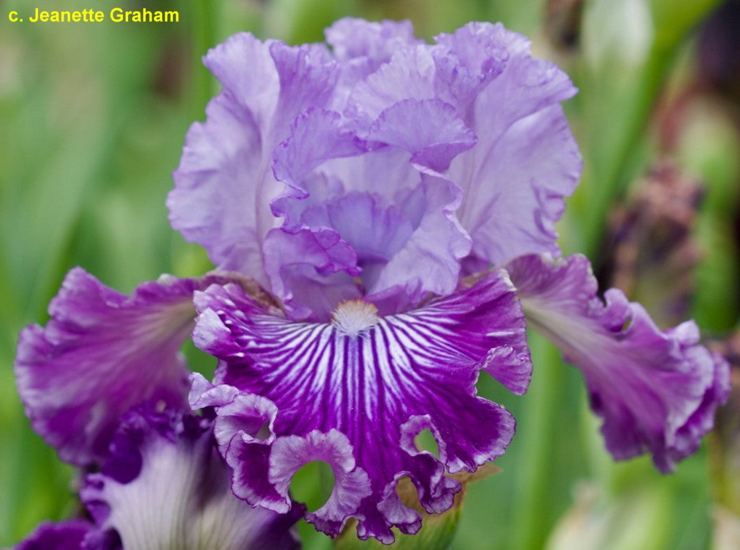 'You're So Veined' (Richard Tasco, R. 2020) Seedling 14-TB-09-46. TB, 35" (89 cm), Early midseason bloom. Standards aster violet (RHS 87C); style arms same, darker on crest edge, slight white side; falls dark violet (RHS 87A), white ground around and below beard, heavily veined dark violet, aster violet rim; beards based white, tips burnt orange in throat and middle, ends aster violet; heavily ruffled. Seedling 10-TB-14-41: ('Smoky Shadows' x 'Tango Amigo') X 'Haunted Heart'. Superstition 2020. Honorable Mention 2022, Award Of Merit 2024.